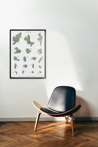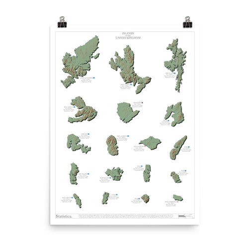 The United Kingdom is made up of hundreds of islands, each of which has it's own identity and people. The UK Islands poster shows shaded-relief imagery of the 18 largest islands by area in the UK (excluding Great Britain), which excludes the Isle of Mann and the Channel Islands. This poster features a super-high level of detail in the terrain imagery, with the colour of the land indicating it's elevation, derived from the UK's Environment Agency's National LIDAR Programme.