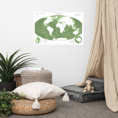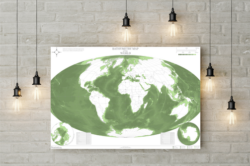 The World Bathymetry Map MKII by Statistica categorises the seabed into depth ranges shown by colour to produce a map like no other, focusing entirely on the oceans and leaving the continents blank, with a minimalistic look. MKII features a refreshed design with additional polar stereographic sub-maps, stats on country sizes by area and population, and extra map paraphernalia.