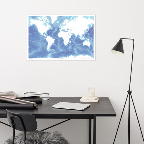 The World Bathymetry Map by Statistica categorises the seabed into depth ranges shown by colour to produce a map like no other, focusing entirely on the oceans and leaving the continents blank, with a minimalistic look. This version includes country borders.